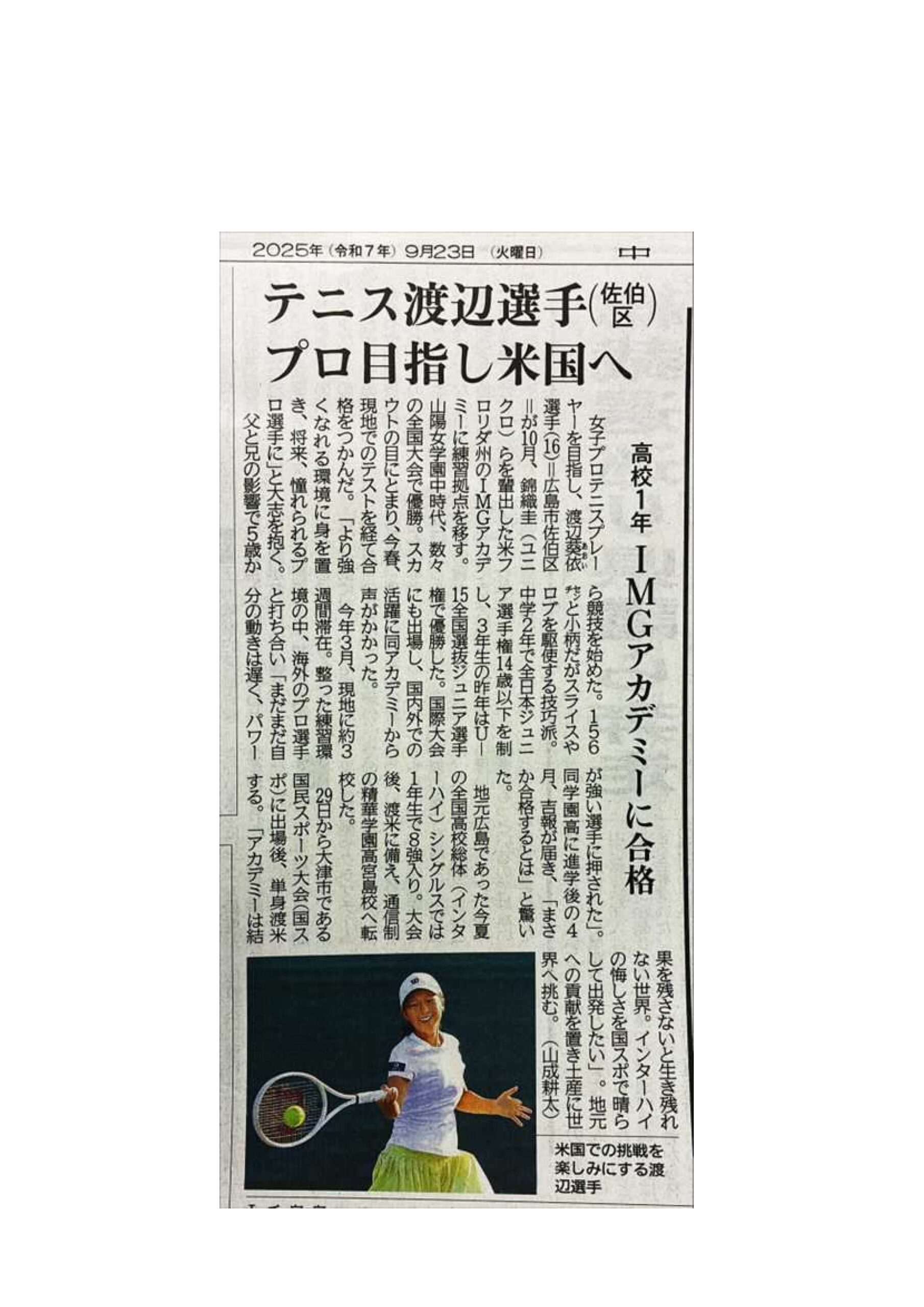 - (中国新聞2025/9/23掲載)弊社が応援しているテニス渡辺葵依選手がアメリカのIMGアカデミーに合格!練習拠点をアメリカに移すことになりました!!